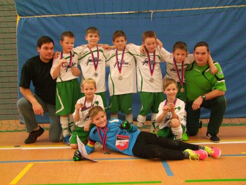 Selten waren Chef-Coach Jörg Irion und sein Co. Oliver Kuhnert so stolz auf die F1 wie am vergangenen Sonntag beim Turnier in Eilenburg. Ein Blick aufs Teilnehmerfeld wies mit Stahl Riesa, dem FC Eilenburg, Fortuna Chemnitz und natürlich RB Leipzig einige klare Turnierfavoriten aus. Aber das grün-weisse Team wuchs an diesem Tag mit Unterstützung der mitgereisten Eltern wirklich über sich hinaus. Glücklich aber verdient konnte bereits im ersten Gruppenspiel Favorit Stahl Riesa mit 1:0 besiegt werden. Vorarbeit mir guter Übersicht durch Mika und Mattis vollendet aus schwieriger Position gekonnt zum Siegtreffer (hier im Video). Im zweiten Gruppenspiel wurde dann mit einem 2:1 Sieg gegen den FSV Beilrode der Halbfinaleinzug klar gemacht. Um hier einem überstarken Team aus dem Weg zu gehen, wäre ein Sieg im abschliessenden Gruppenspiel gegen RB Leipzig nötig gewesen. Unsere Jungs spielten eindrucksvoll, Tjorven nahm das RB Tor unter Dauerbeschuss (hier im Video). Allein ein Treffer wollte nicht heraus springen und am Ende siegte RB knapp mit 1:0. So hieß das schwere Halbfinallos für uns Fortuna Chemnitz, eine absolute Spitzenmannschaft in dieser Alterklasse. Endstand nach regulärer Spielzeit 1:1 und so folgte ein nervenaufreibendes und nicht enden wollendes 9 m - Schiessen (hier im Video). Am Ende bescherte uns Keeper Tom mit tollen Paraden den Sieg. Im anderen Halbfinale siegte erwartungsgemäss RB Leipzig und so spielte der Nachwuchs des Zweitligisten im Finale erneut gegen unsere grün-weissen Youngster. Nach drei schnellen Leipziger Treffern fing sich unser Team und konnte durch Jeremy auf 1:3 verkürzen. Den Anschlusstreffer zum 2:3 durch Tjorven gab der Schiedsrichter auf Grund einer zu schnellen Freistossausführung leider nicht. So warfen wir alles nach vorn und kassierten am Ende noch das 1:4 durch den verdienten Turniersieger RB Leipzig. Fazit: Ein wirklich toller Abschluss im Fußballjahr 2014 für unsere F1 bei einem Turnier mit durchweg Top-Teams. Zumindest in der Halle brauchen wir also den überregionalen Vergleich nicht scheuen. Am Ende gab es durch die RB-Trainer mit anerkennenden Worten für unsere starke Teamleistung die wohl schönste Wertschätzung. Für Piesteritz spielten: Tom, Ben, Tjorven, Eric, Mattis, Jeremy, Florian und Mika.