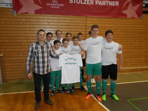 Die C-Jugend möchte sich bei Herrn Maik Petermann von der Firma " Die Fliesenleger" für das Sponsoring der neuen Aufwärmshirts bedanken. Die offizielle Übergabe an die Mannschaft um Kapitän Tim fand am letzten Sonntag beim eigenen Hallenturnier statt.
