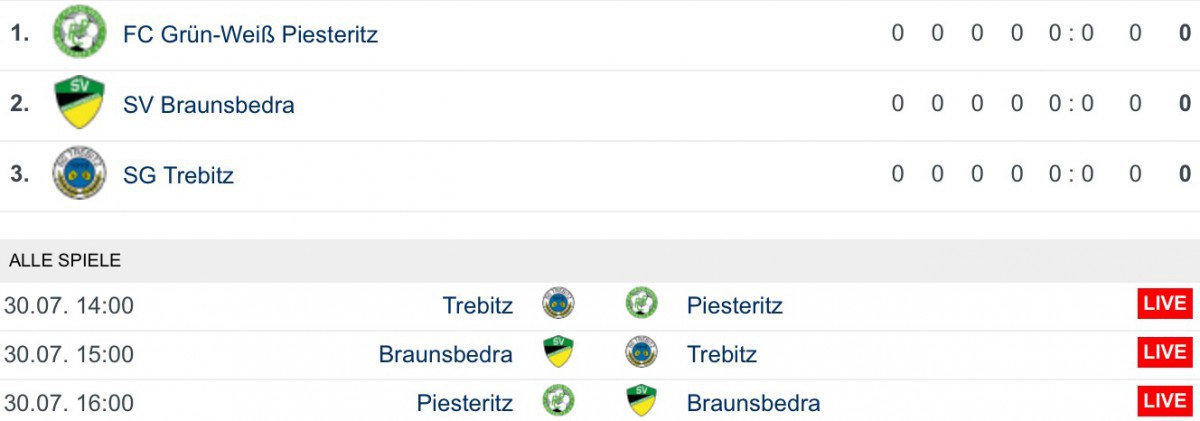 Am Samstag gibt es kurzfristig ein Blitzturnier im Volkspark. Neben dem FC Grün-Weiß ist der SV Braunsbedra und die SG Trebitz am Start. Gespielt wird 1x 45 Minuten. Nun ist auch der Spielplan bekannt.