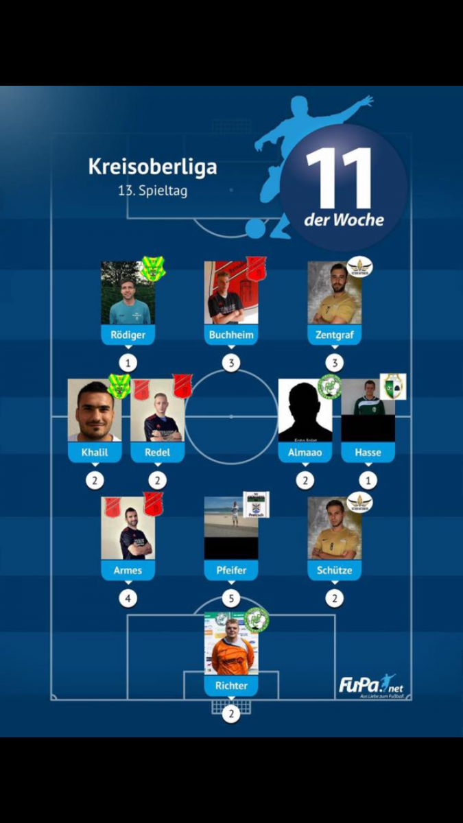 Alexander "Jerry" Richter und sein Teamkollege Jamal Almaao schafften am 13.Spieltag den Sprung in die FuPa-11 der Woche. Beide sind bereits das zweite mal vertreten. Glückwunsch an Jerry und Jamal für die Nominierung.