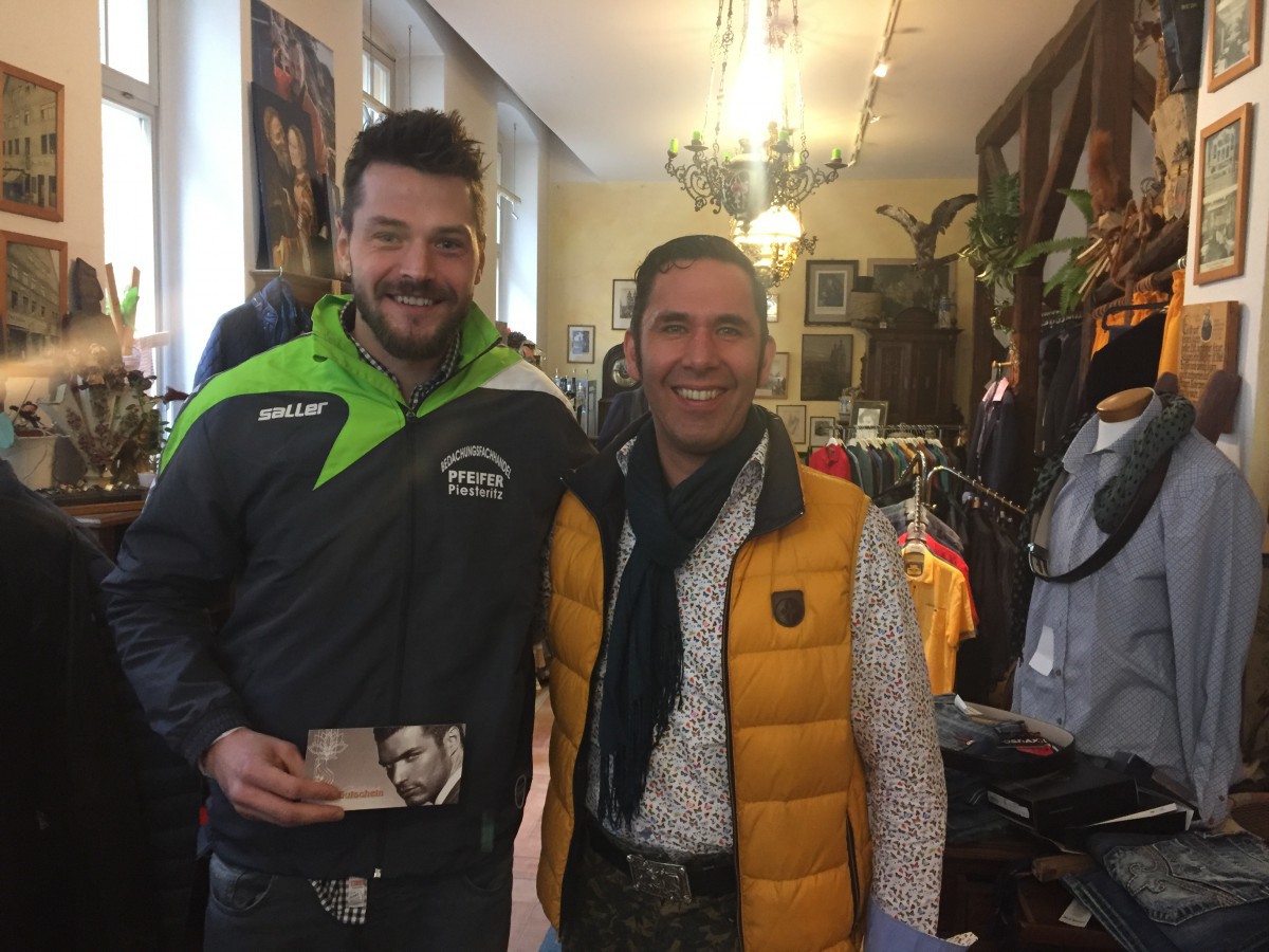 Nun konnten wir den Gewinner-Gutschein überreichen. Dafür trafen sich der Sieger Jörg Steiner, Daniel Pflug (Inhaber Sfilata di Moda) und Philipp Scopp in der Innenstadt von Wittenberg.