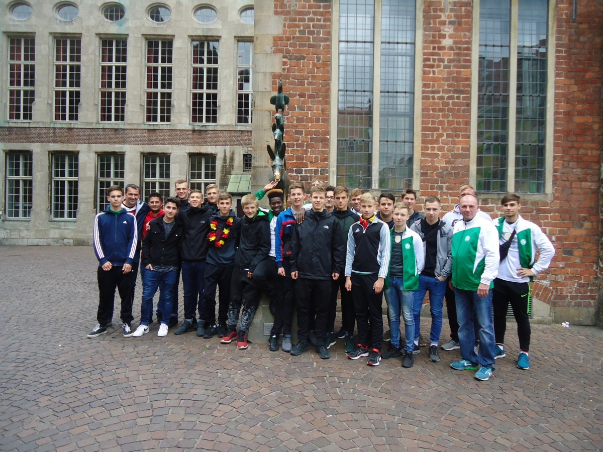 Am vergangenen Wochenende war es endlich soweit. Die U17 machte die Hansestadt unsicher. Gut in Bremen angekommen, spielten wir gegen den FC Union 60 Bremen unser Freundschaftsspiel. Zur Halbzeit lagen wir mit 2:1 in Führung. Nach dem Schlußpfiff hieß es dann 4:2 für die Gastgeber. Bei besserer Chancenverwertung wäre allerdings ein anderes Ergebnis möglich gewesen. Das war jedoch zweitrangig. Alle Spieler kamen zum Einsatz und zeigten eine gute Leistung. An dieser Stelle nochmals vielen Dank an den `FC Union` für die Ausrichtung des Spiels und den herzlichen Empfang. Frisch geduscht bezogen wir anschließend Quartier auf unserem Schiff. Im Anschluss ging es auf Erkundungstour in die Stadt und natürlich zu den " Bremer Stadtmusikanten". Das gemeinsame Public Viewing war durch das Tor von Toni Kroos in letzter Sekunde ein voller Erfolg. Auch für unseren Sportvorstand Maik Trollmann gab es nach dem Tor kein halten mehr. Es folgte eine einzigartige Sieges- und Abschlussparty an Deck der "Weser", die für einige erst im Morgengrauen endete. Aus Sicherheitsgründen werden davon keine Bilder veröffentlicht. Der Morgen danach begann mit einem ausgiebigen Frühstück. Etwas müde ging es zum Weserstadion. Die aufschlussreiche Stadionführung machte uns mit den Räumlichkeiten, den Abläufen des Vereins und eines Bundesligaspieltages vertraut. Damit war unser Ausflug nach Bremen auch schon beendet. Gegen 17 Uhr kamen wir wohlbehalten wieder in unserem Volkspark an.