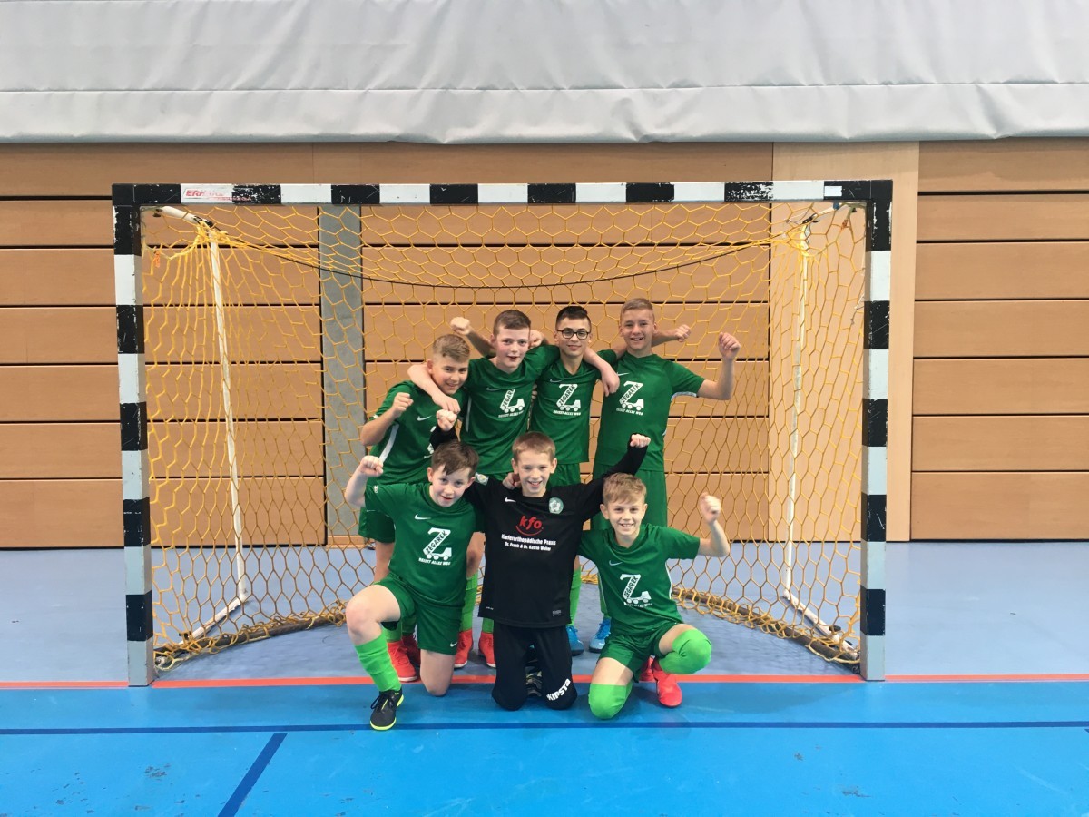 Rechnen hin oder her wie so oft liegt die Wahrheit auf dem Platz, also rein ins letzte Spiel. Die Mannschaft war nach drei Siegen in folge hoch Motiviert. Schnell konnten wir mit 1:0 in Führung gehen, bekamen aber auch schnell das 1:1. Zahlen lügen nicht und so war klar das man 5:1 gewinnen musste um das bessere Torverhältnis zu haben. Was jetzt passierte war einfach nur ein tolles Erlebnis. Die gesamte Mannschaft inklusive Wechselbank drehten nochmal komplett auf und brachten das Ergebnis vor der Schlussphase auf 4:1. Durch den Kampfgeist stand ein großer Teil der Halle nun hinter uns. Nur noch ein Tor. Nur noch wenige Sekunden. Unser Torhüter Lennox war schon weit vor seinem Kasten, keine 10 Sekunden mehr, letzte Chance, Lennox Schießt von der Mitte und findet Marvin der den Ball im Tor unterbringen kann, Wahnsinn. Nach Korrektur der Uhr sind nun noch 2 Sekunden zu Spielen und wir gewinnen 5:1.