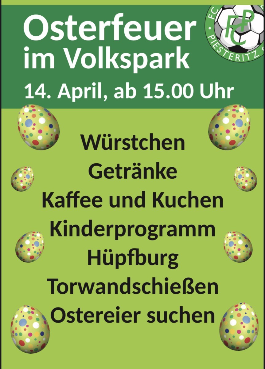 Der FC Grün-Weiß Piesteritz lädt herzlich zu seinem Osterfeuer am 14.04.2022 ein. Für die Verpflegung wird gesorgt sein und als Abschluss des Tages empfängt unsere VL-Mannschaft noch den Bernburger SC, sodass jede Menge Unterhaltung vorhanden sein wird.