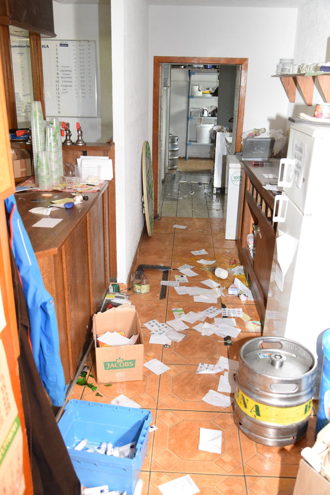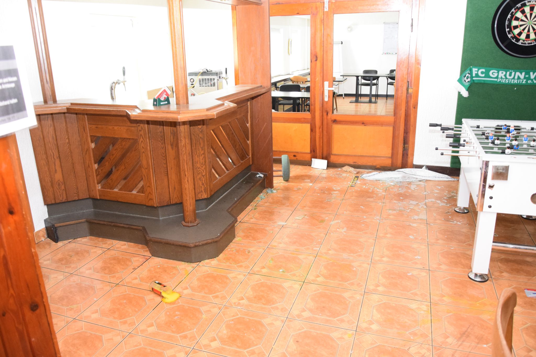 So wurden im Trainer-, Schiedsrichter- und Besprechungsraum sowie in der Gaststätte enormer Sachschaden betrieben, indem Glastüren, Tische und Stühle sowie diverses Einrichtungsmaterial beschädigt und zerstört worden ist. Ob Gegenstände entwendet wurden, ergibt die kommende Prüfung.