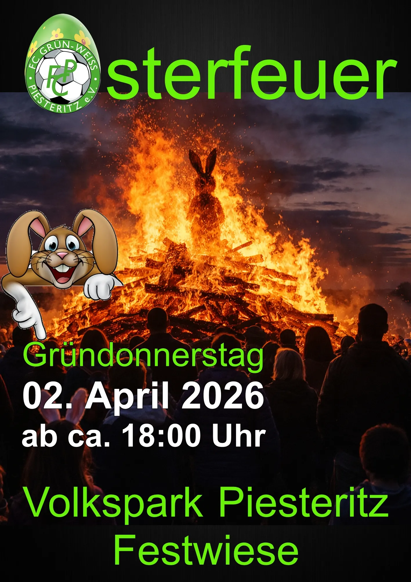 Am Gründonnerstag den 02. April 2026 lädt der FC Grün-Weiß Piesteritz zum traditionellen Osterfeuer auf der Piesteritzer Festwiese ein.
